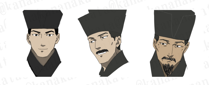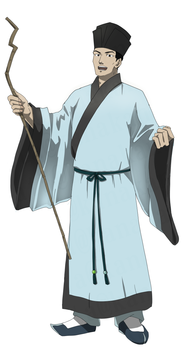 元代の「蘇軾像」が服装の参考です。若い時分に杖を持つ設定は特にないです。