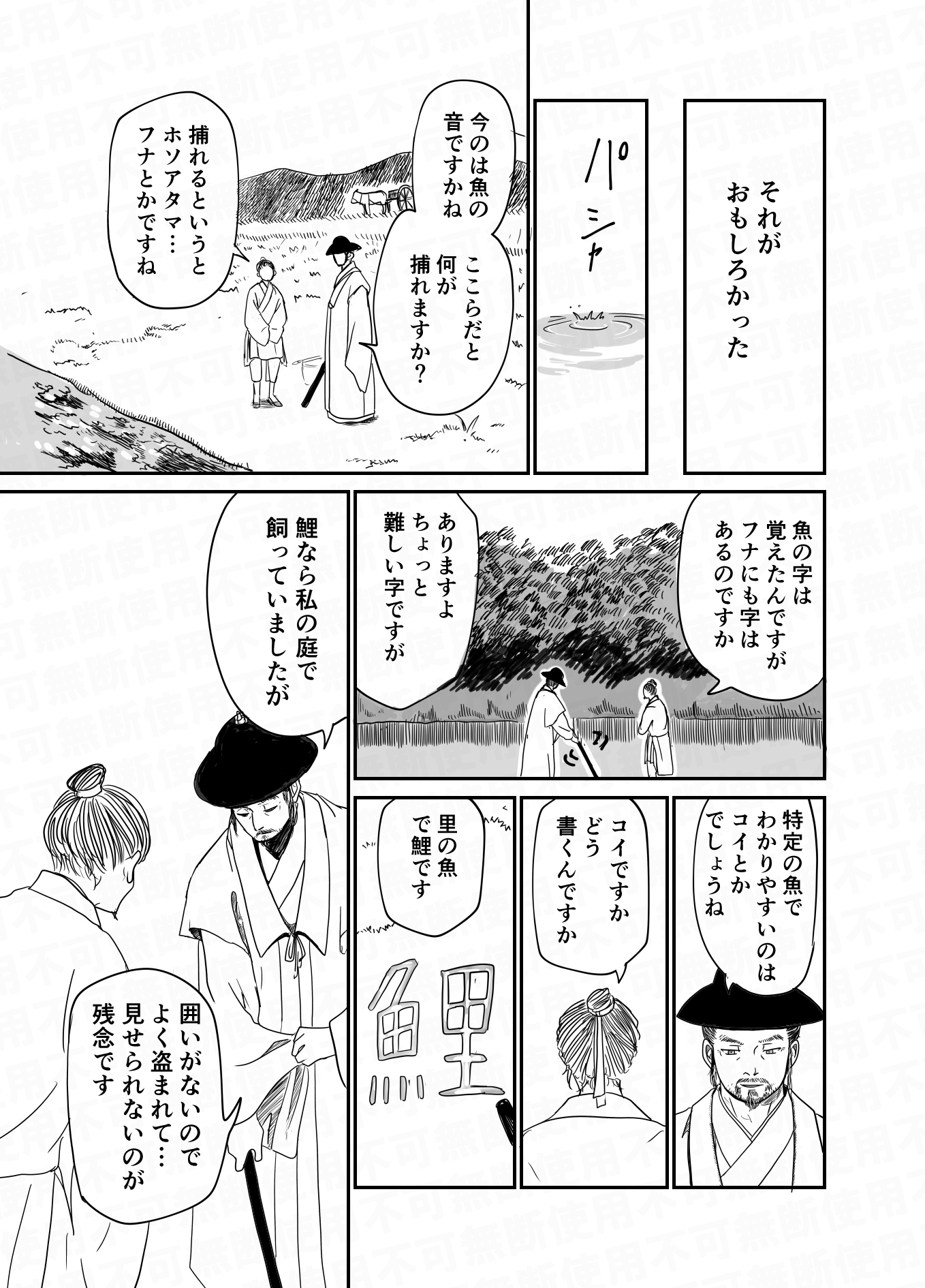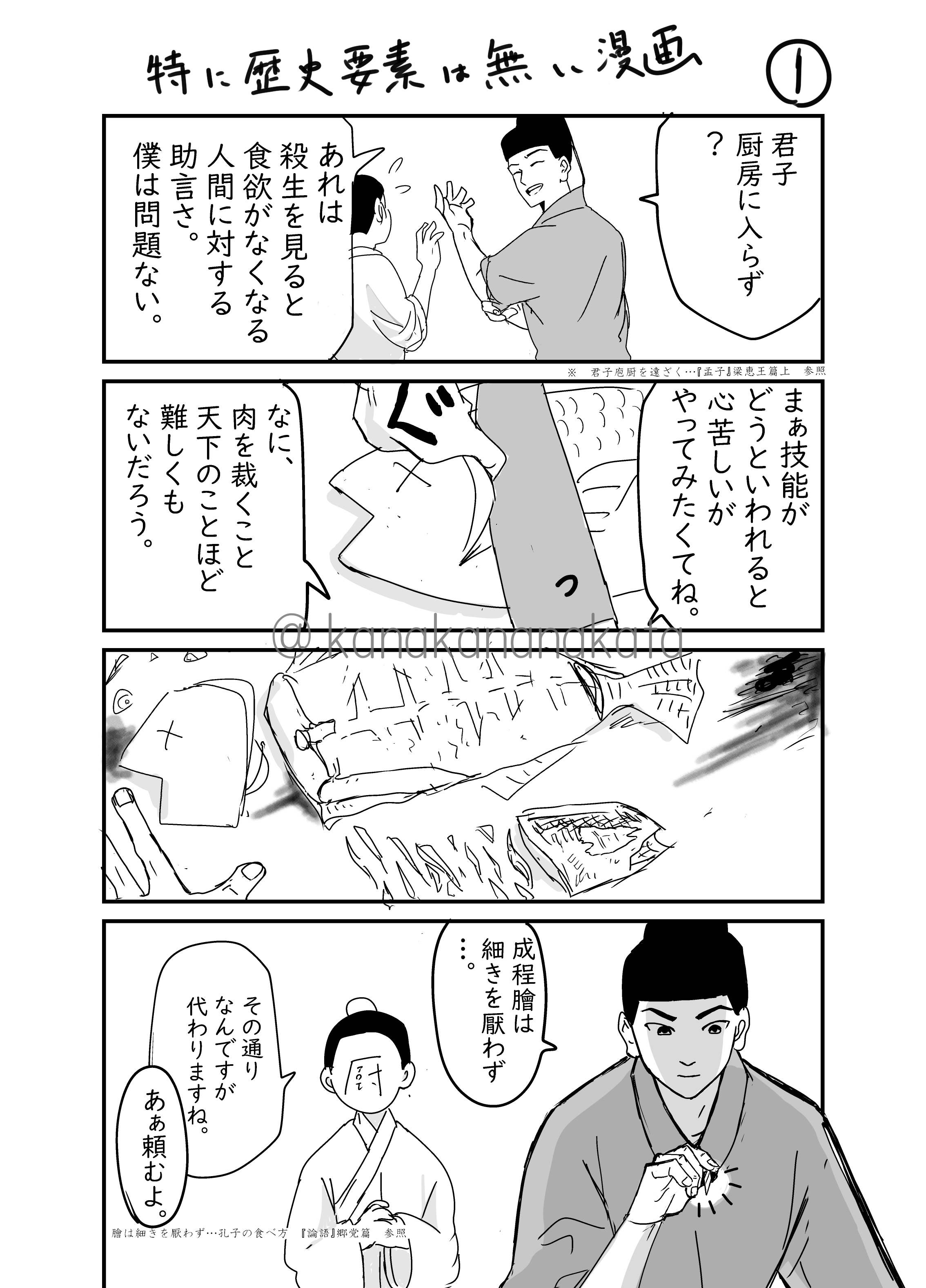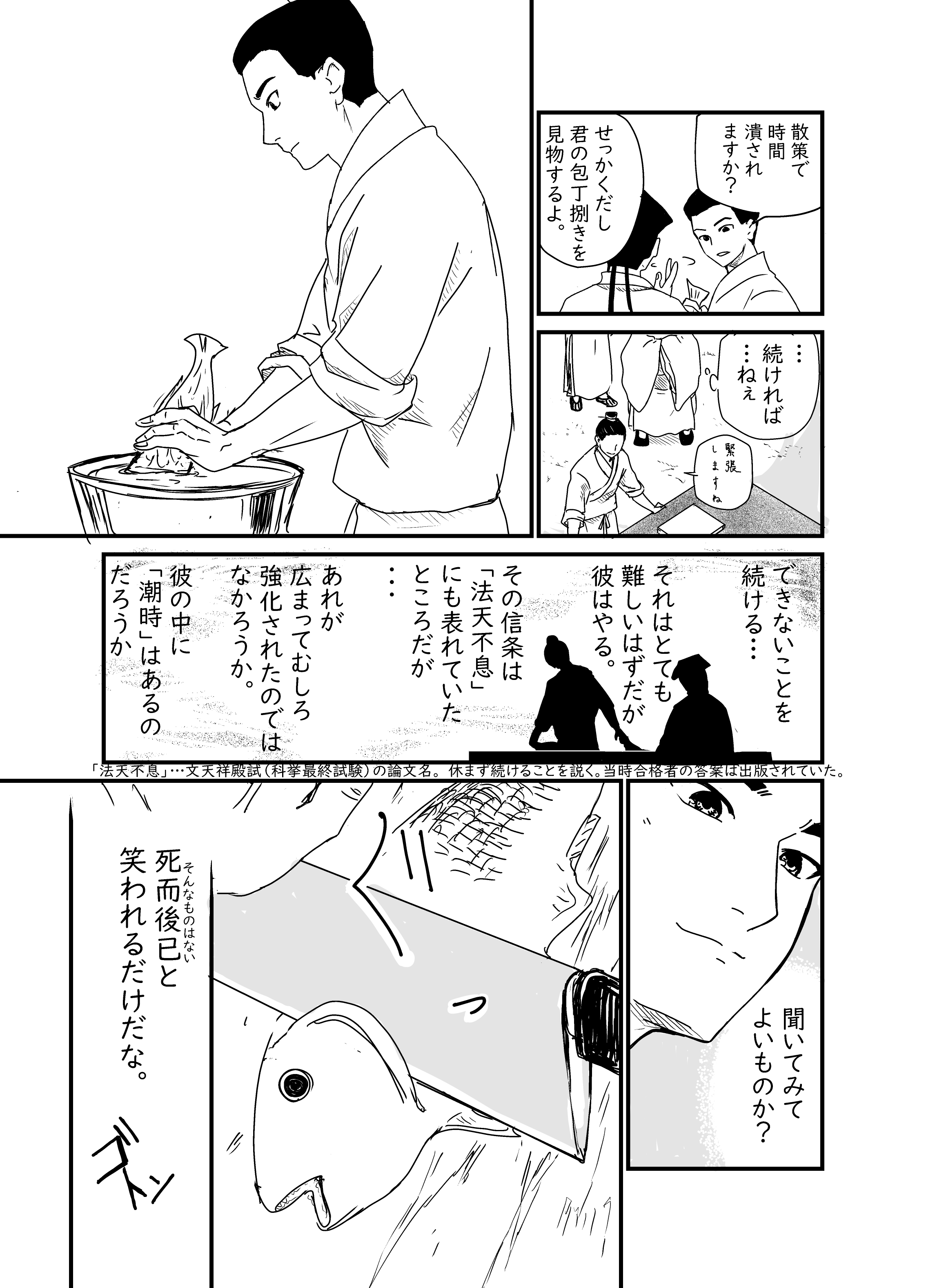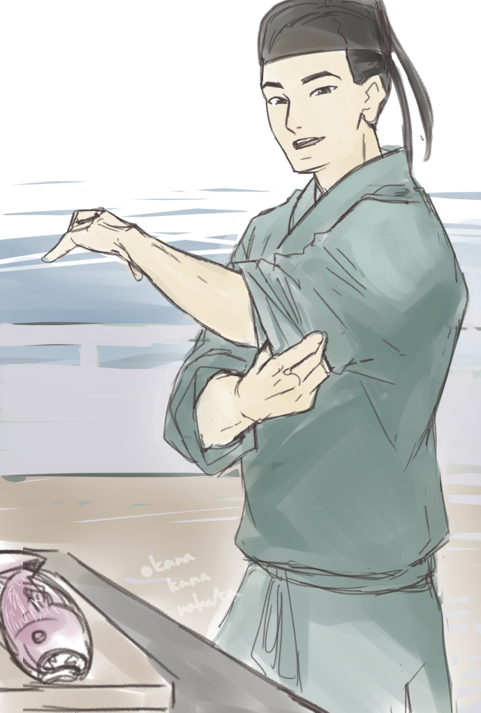 本人考案のレシピ(文山肉丁)と言われるものがある文の旦那に魚を捌いてもらおうとするだけの絵。そのレシピは豚肉だけどまぁ宋代は刺身文化あるしね